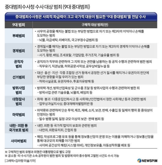 윤창렬 추진단장은 "기존 부패·경제범죄 등 중대범죄 범위에 더해 사이버·마약·국가안보를 포함한 9대 범죄 수사권을 부여하되, 구체적 범죄 범위는 대통령령 시행령에서 정하도록 했다"고 밝혔다.