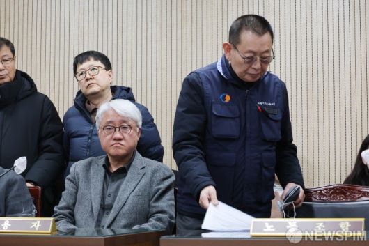 [서울=뉴스핌] 이형석 기자 = 박점곤 서울시버스노동조합 위원장(오른쪽)이 12일 오후 서울 영등포구 서울지방노동위원회에서 열린 특별조정위원회 사후 조정회의에서 자리하고 있다. 오른쪽 두 번째는 김정환 서울시버스운송사업조합 이사장. 2026.01.12 leehs@newspim.com |
