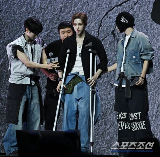 [스포츠조선 정빛 기자] 그룹 알파드라이브원 아르노가 목발을 짚고 나왔다.