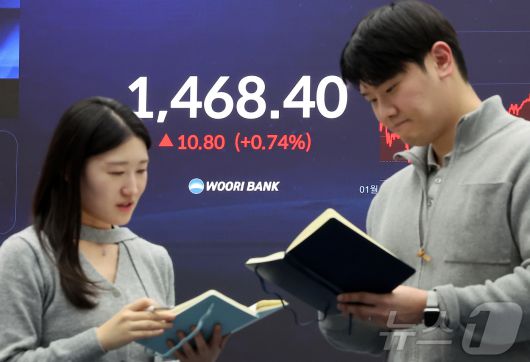 12일 오후 서울 중구 우리은행 본점 딜링룸 전광판에 증시 표시가 나오고 있다. 서울외환시장에서 달러·원 환율은 전일 오후 3시 30분 주간종가 대비 10.8원 오른 1468.40원을 기록했다. 2026.1.12/뉴스1 ⓒ News1 김진환 기자 |