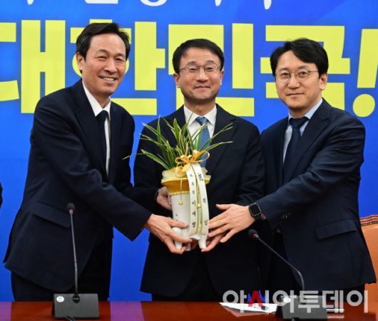 한병도 더불어민주당 신임 원내대표(가운데)가 12일 국회에서 우상호 청와대 정무수석으로부터 이재명 대통령의 축하 난을 전달 받고 있다. 우측은 천준호 원내운영수석부대표/이병화 기자 |