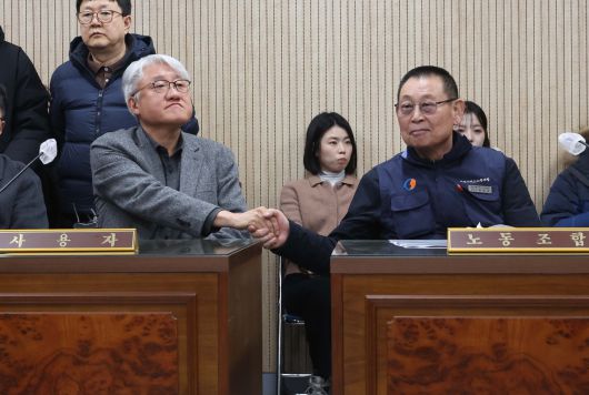 서울시버스노동조합(서울버스노조)이 예고한 파업이 하루 앞으로 다가온 12일 서울지방노동위원회에서 열린 특별조정위원회 사후 조정회의에서 김정환(왼쪽) 서울시버스운송사업조합 이사장과 박점곤 서울시버스노동조합 위원장이 악수하고 있다. 신태현 기자 holjjak@ |