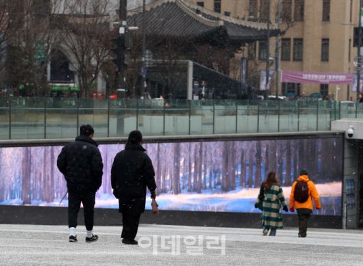 [이데일리 김태형 기자] 12일 오후 서울 광화문네거리 인근에서 눈이 내리는 가운데 시민 및 관광객들이 이동하고 있다. 이날 서울은 아침 영하 10도의 추위를 보였으며 1cm 가량의 눈이 내릴 것으로 예보됐다.