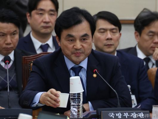 안규백 국방부 장관이 12일 오후 서울 여의도 국회에서 열린 법제사법위원회 전체회의에서 의원 질의를 들으며 물을 마시고 있다. / 사진=뉴시스 |