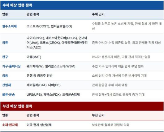 블룸버그인텔리전스에 따르면 주로 중국 등 아시아 국가에서 제품을 수입하는 의류·완구 업종이 대표 수혜주로 거론된다. 관련 종목들은 작년 11월 대법관들이 심리 과정에서 관세에 회의적인 태도를 보이자 주가가 일제히 상승한 바 있다.