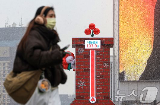 (서울=뉴스1) 이호윤 기자 = 12일 서울 종로구 광화문광장에 설치된 사랑의 온도탑이 나눔온도 103.9도를 보이고 있다. 이날 사랑의열매 사회복지공동모금회는 ‘희망 2026 나눔캠페인’ 사랑의 온도탑의 나눔 온도가 100도를 돌파했다고 밝혔다. 2026.1.12/뉴스1