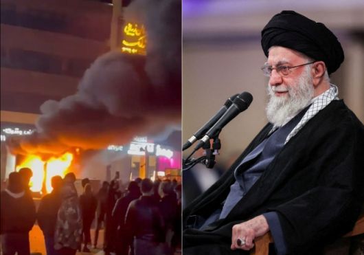 이란 테헤란에서 9일(현지시간) 반정부 시위가 이어지는 가운데, 시위 현장에서 불길이 치솟고 있다(왼쪽). 이와 별도로 이란 최고지도자 아야톨라 알리 하메네이는 지난 3일 테헤란에서 열린 회의에서 연설하고 있다(오른쪽). 물가 폭등과 통화 가치 급락 등 심각한 경제 위기를 계기로 시작된 시위는 대학과 주요 도시로 확산되며 정권에 대한 압박을 키우고 있다. 2026.1.3·9 UPI·로이터 연합뉴스 |