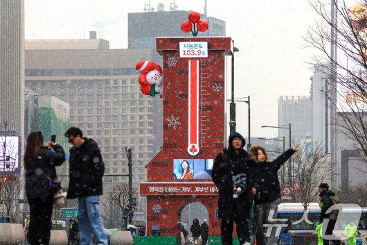 (서울=뉴스1) 이호윤 기자 = 12일 서울 종로구 광화문광장에서 외국인 관광객들이 사랑의 온도탑을 배경으로 사진을 찍고 있다. 이날 사랑의열매 사회복지공동모금회는 ‘희망 2026 나눔캠페인’ 사랑의 온도탑의 나눔 온도가 100도를 돌파했다고 밝혔다. 2026.1.12/뉴스1