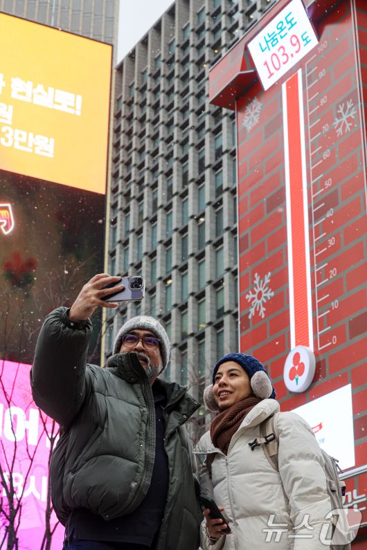 (서울=뉴스1) 이호윤 기자 = 12일 서울 종로구 광화문광장에서 외국인 관광객들이 사랑의 온도탑을 배경으로 사진을 찍고 있다. 이날 사랑의열매 사회복지공동모금회는 ‘희망 2026 나눔캠페인’ 사랑의 온도탑의 나눔 온도가 100도를 돌파했다고 밝혔다. 2026.1.12/뉴스1