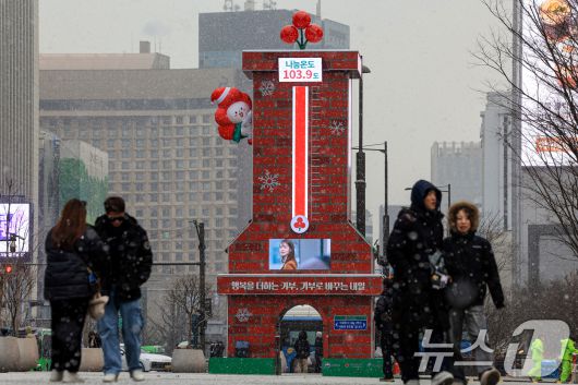 (서울=뉴스1) 이호윤 기자 = 12일 서울 종로구 광화문광장에서 외국인 관광객들이 사랑의 온도탑을 배경으로 사진을 찍고 있다. 이날 사랑의열매 사회복지공동모금회는 ‘희망 2026 나눔캠페인’ 사랑의 온도탑의 나눔 온도가 100도를 돌파했다고 밝혔다. 2026.1.12/뉴스1