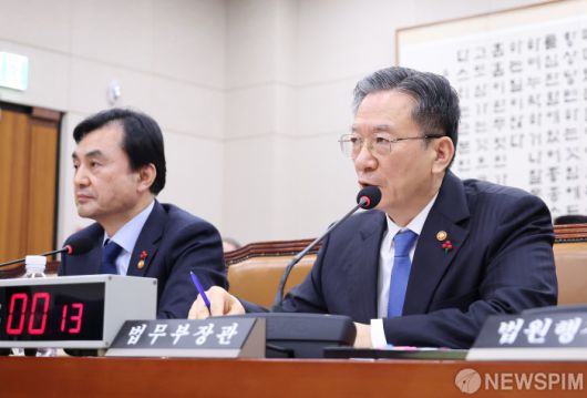 [서울=뉴스핌] 정일구 기자 = 정성호 법무부 장관이 12일 오후 서울 여의도 국회에서 열린 법제사법위원회 전체회의에서 의원 질의에 답하고 있다. 2026.01.12 mironj19@newspim.com |