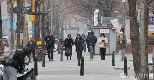 [서울=뉴스핌] 이형석 기자 = 12일 오후 서울 여의도 인근에서 시민들이 내리는 눈을 맞으며 발걸음을 재촉하고 있다. 2026.01.12 leehs@newspim.com