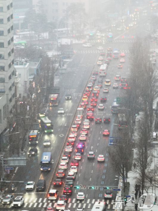 (서울=뉴스1) 황기선 기자 = 눈이 내리는 12일 오후 서울 남대문로 일대가 차량 정체를 빚고 있다. 2026.1.12/뉴스1