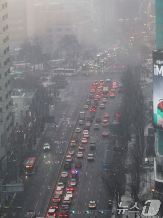 (서울=뉴스1) 황기선 기자 = 눈이 내리는 12일 오후 서울 남대문로 일대가 차량 정체를 빚고 있다. 2026.1.12/뉴스1