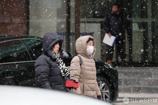 [서울=뉴스핌] 이형석 기자 = 12일 오후 서울 여의도 인근에서 시민들이 내리는 눈을 맞으며 발걸음을 재촉하고 있다. 2026.01.12 leehs@newspim.com