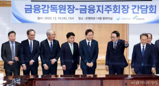 (서울=뉴스1) 이광호 기자 = 이찬진 금융감독원장(왼쪽 다섯번째)이 10일 오후 서울 중구 명동 은행회관에서 열린 금융지주회장들과의 간담회에 앞서 참석자들과 기념촬영을 마친뒤 자리로 향하고 있다. 2025.12.10/뉴스1 Copyright (C) 뉴스1. All rights reserved. 무단 전재 및 재배포, AI학습 이용 금지. /사진=(서울=뉴스1) 이광호 기자 |