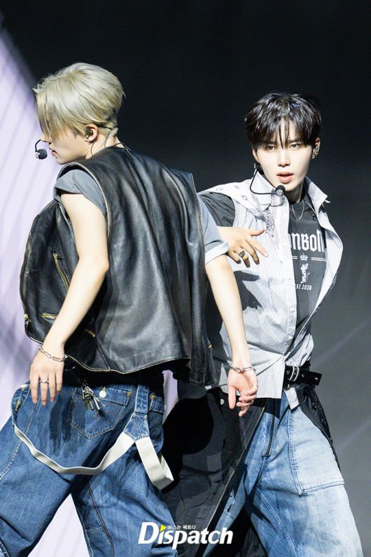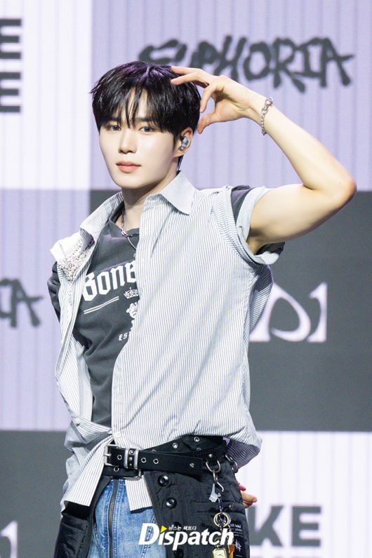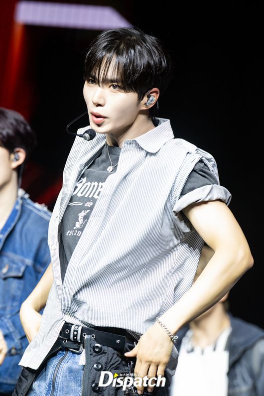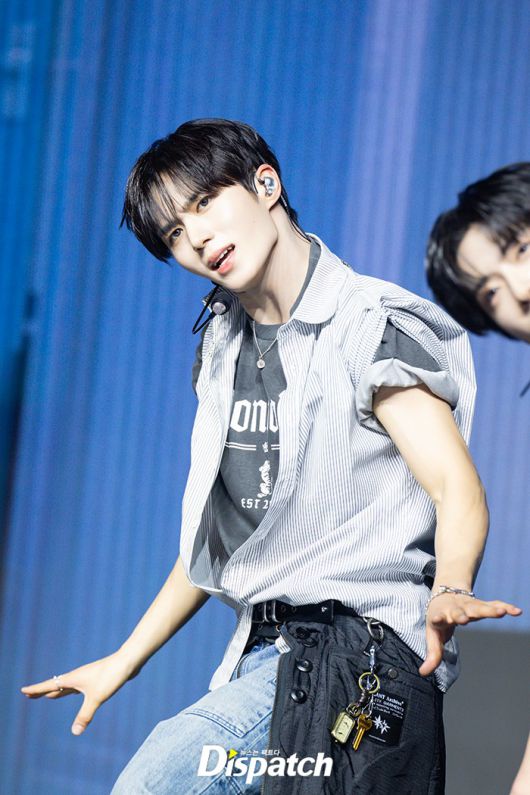 준서는 스트라이프 셔츠와 데님으로 멋을 냈다. 잘생긴 비주얼과 파워풀한 댄스가 시선을 사로잡았다.