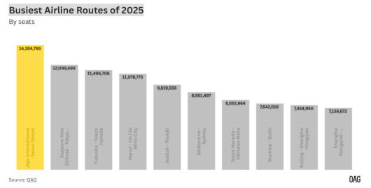 OAG는 "아시아와 중동이 전년 대비 좌석 증가의 주요 동력"이라며 "글로벌 항공 산업의 중심이 아시아와 중동으로 이동하고 있다"고 평가했다.