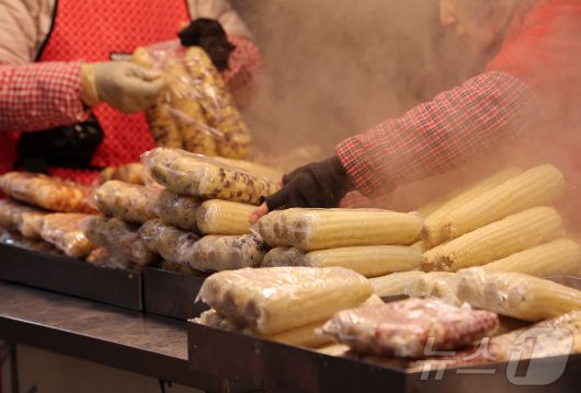 9일 서울 동대문구 경동시장에서 한 상인이 옥수수를 정리하고 있다. 이재명 정부는 이날 열린 '2026년 경제성장전략'을 통해 밥상 물가 안정을 위한 쌀·콩·사과·배·계란 등 주요 품목의 수급에 대해 발표했다. 사과·배는 계약재배 물량을 8000톤으로 늘리고, 식품 원료 22종에는 할당관세를 적용한다. 수입 가격 급등 시에는 긴급할당관세를 활용할 방침이다. 2026.1.9/뉴스1 ⓒ News1 김성진 기자 |