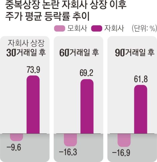 반대로 자회사 주가는 정반대의 흐름을 보였다. 중복상장 논란 속에서도 새로 상장한 자회사들의 주가는 공모가 대비 상장 후 30거래일 기준 평균 73.9% 상승했다. 60거래일 후에도 69.2%, 90거래일 후에도 61.8%의 상승률을 유지했다. 모회사에서 빠져나온 성장 기대가 자회사로 그대로 이전되면서 ‘가치 이동’이 현실화됐다는 뜻이다.