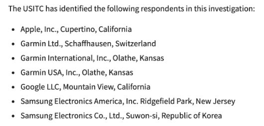 ITC는 이번 조사에서 애플, 구글, 가민, 삼성전자 미국 법인, 삼성전자 본사를 피조사 대상으로 지정했다. 삼성전자는 수원 본사와 미국 뉴저지 법인이 모두 조사 대상에 포함됐다.
