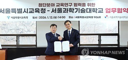 (서울=연합뉴스) 정근식 서울시 교육감(왼쪽)과 김동환 서울과학기술대학교 총장이 12일 서울 종로구 서울시교육청에서 첨단공동교육연구센터의 공동 구축·운영과 피지컬 AI 분야 연구·개발 및 인력 양성 등 첨단 분야 교육·연구 협력을 위한 업무협약을 체결, 기념 촬영하고 있다. 2026.1.12 [서울시교육청 제공. 재판매 및 DB 금지]