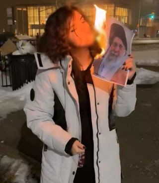 한 이란 여성이 담뱃불로 아야톨라 알리 하메네이 이란 최고자의 사진을 태우고 있다./엑스 |