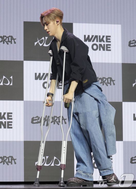 그룹 알파드라이브원(ALD1)의 아르노가 12일 서울 용산구 블루스퀘어 SOL트래블홀에서 열린 미니 1집 'EUPHORIA'(유포리아) 발매 쇼케이스에 목발을 짚고 무대를 오르고 있다. 2026.1.12/뉴스1 ⓒ News1 권현진 기자 |
