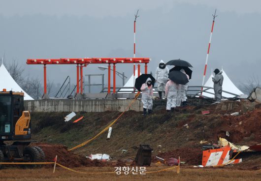 무안공항 제주항공 여객기 참사 8일째인 지난해 1월5일 전남 무안국제공항 사고현장에서 관계자들이 방위각시설(로컬라이저)을 살펴보고 있다. 무안|권도현 기자 |