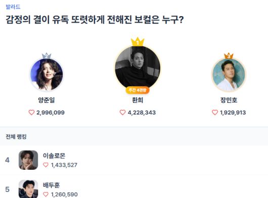 이번 투표에서는 1~3위 모두 감성 전달력과 무대 신뢰도를 바탕으로 팬들과 긴 호흡을 이어온 아티스트들이 상위권에 올랐다는 공통점이 드러났다. 발라드 장르를 중심으로 한 깊이 있는 경쟁과 팬덤의 관심은 앞으로도 이어질 전망이다.