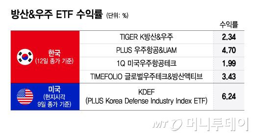 임은혜 삼성증권 연구원도 "글로벌 지정학적 불안정성이 여전히 높은 가운데, 유럽 주요국의 방위 산업 투자를 주도하는 재정 확대 정책 기대감이 올해도 지속될 것으로 보인다"며 "ETF 투자 측면에서는 투자할 만한 자산 규모의 국방·안보 업종 ETF가 우주·항공 관련 기업과 함께 묶여있어 우주 기술 성장성에 대한 기대감이 높아지는 국면에서 두드러진 성과를 보이고 있다"고 조언했다.