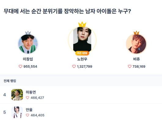 2위는 이창섭이 95만5554표로 차지했다. 오랜 활동을 통해 다져온 가창력과 안정적인 무대 운영이 팬들의 꾸준한 지지를 받았다. 개인 활동과 무대를 병행하며 보여준 성실함이 상위권 유지의 배경으로 언급된다.