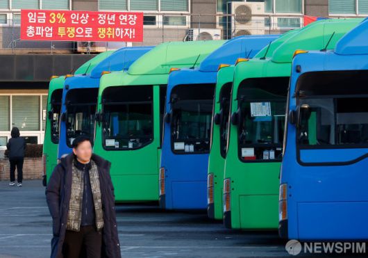 [서울=뉴스핌] 류기찬 기자 = 대법원의 통상임금 판결에 따른 임금 인상안을 두고 서울시버스운송사업조합(사측)과 대립해온 서울시버스노동조합(노조)이 파업 예고일을 하루 앞두고 막판 협상을 진행한다. 사측은 실무자급 협상에서 10%대 임금 인상률을 제안했고, 노조는 최소 12.85% 인상을 요구하고 있다. 사진은 12일 오전 서울 은평구 진관공영차고지에 버스가 주차되어 있다. 2026.01.12 ryuchan0925@newspim.com |