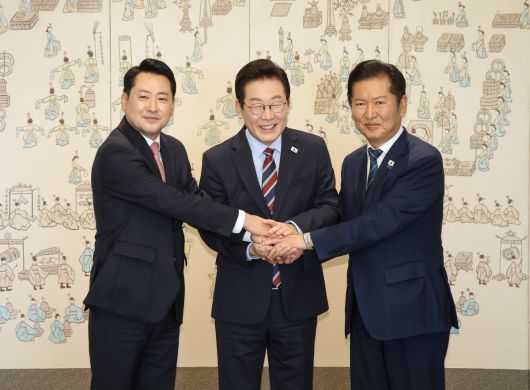 이재명 대통령이 지난해 9월8일 용산 대통령실에서 더불어민주당 정청래 대표, 국민의힘 장동혁 대표와 오찬 회동을 하기 전 기념 촬영을 하고 있다. 대통령실사진기자단 |