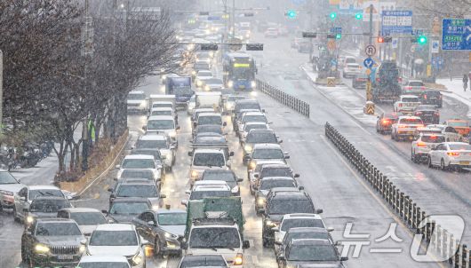 (서울=뉴스1) 이호윤 기자 = 눈이 내리는 12일 오후 서울 마포구 인근 도로가 정체되고 있다. 2026.1.12/뉴스1256@news1.krCopyright ⓒ 뉴스1. All rights reserved. 무단 전재 및 재배포, AI학습 이용 금지.