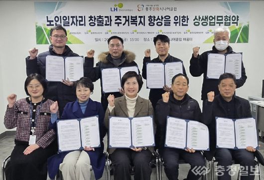 충주문화시니어클럽과 LH 임대아파트 7개 단지 관계자들이 '노인복지 증진을 위한 업무협약'을 체결하고 있다. |