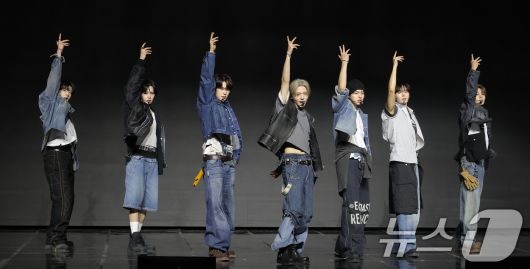 (서울=뉴스1) 권현진 기자 = 그룹 알파드라이브원(ALD1)의 상현(왼쪽부터)과 안신, 건우, 상원, 이리오, 준서, 씬롱이 12일 서울 용산구 블루스퀘어 SOL트래블홀에서 열린 미니 1집 'EUPHORIA'(유포리아) 발매 쇼케이스에서 선공개곡 ‘포뮬러’ 퍼포먼스를 선보이고 있다. 2026.1.12/뉴스1