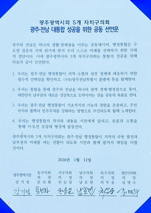 광주시와 동구·서구·남구·북구·광산구의회는 12일 '광주·전남 대통합 성공을 위한 공동 선언문'을 발표하고, 광주·전남 행정통합이 수도권 집중과 지역 위기에 대응하기 위한 시대적 선택이라는 점을 분명히 했다.