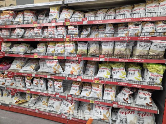 과자 매대가 심플러스 PB 상품으로 가득하다. (사진=한전진 기자) |