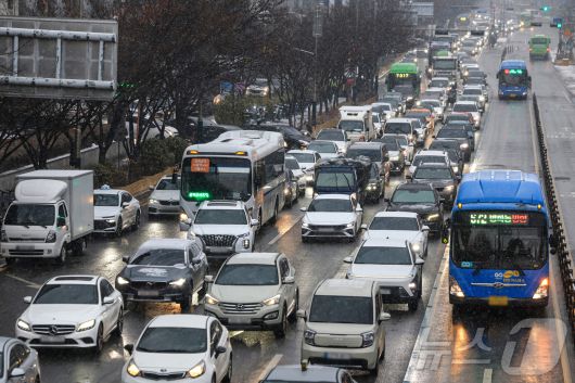 (서울=뉴스1) 이호윤 기자 = 눈이 내리는 12일 서울 마포구 인근 도로가 정체되고 있다. 2026.1.12/뉴스1