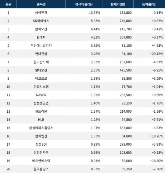 검색비율 2위의 SK하이닉스(000660)는 등락률 0.67%로 횡보했다. 검색비율 3위의 한화오션(042660)은 8.41% 상승 마감했다. 검색비율 4위 현대차(005380)는 0.27% 상승하며 강보합으로 마감했다. 검색비율 5위 두산에너빌리티(034020)는 4.63% 상승했다.