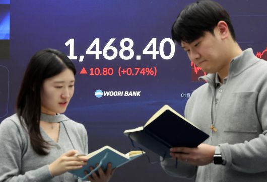 12일 오후 서울 중구 우리은행 본점 딜링룸 전광판에 증시 표시가 나오고 있다. 서울외환시장에서 달러·원 환율은 전일 오후 3시 30분 주간종가 대비 10.8원 오른 1468.40원을 기록했다. 2026.1.12 뉴스1 |