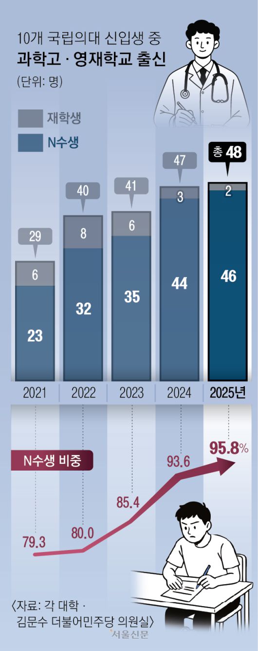 서울신문이 12일 김문수 더불어민주당 의원실을 통해 입수한 ‘최근 5년간 과학고·영재학교 출신 10개 국립의대 신입생 현황’을 보면 의대에 간 N수생은 2021년 23명에서 2022년 32명, 2023년 35명, 2024년 44명, 2025년 46명으로 5년 연속 증가했다. 5년간 N수로 10개 의대에 간 영재학교·과학고생은 180명(87.8%)에 달했다. 나머지 사립의대 29곳을 포함하면 N수생 규모는 훨씬 클 것으로 보인다.