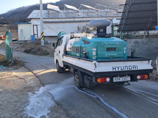 충북 보은군 방역차량이 고병원성 조류인플루엔자(AI) 유입 차단을 위해 농가 도로를 소득하고 있다. /보은군 |