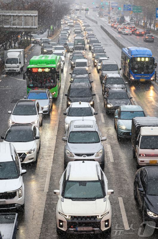 (서울=뉴스1) 이호윤 기자 = 눈이 내리는 12일 서울 마포구 인근 도로가 정체되고 있다. 2026.1.12/뉴스1