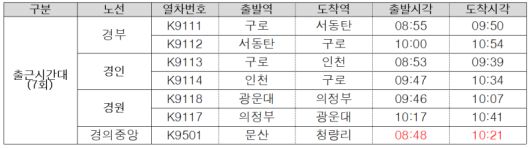 한국철도공사(코레일)는 13일 예고된 서울시 버스 파업 돌입 시 전동열차를 7회 추가 운행한다고 12일 밝혔다.임시 전동열차는 경부·경인·경원·경의중앙 4개 노선에서 출근시간대 7회 운행할 예정이다.