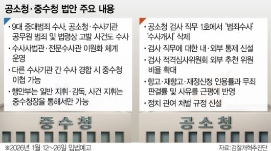 국무총리실 산하 검찰개혁추진단은 이날 정부서울청사에서 기자 간담회를 열고 이 같은 내용을 골자로 한 공소청·중수청 법안 입법예고안을 발표했다. 정부안에는 검찰을 대신해 중대 범죄 수사를 전담할 중수청과 공소 제기와 유지를 담당할 공소청의 역할과 조직 구성이 담겼다.