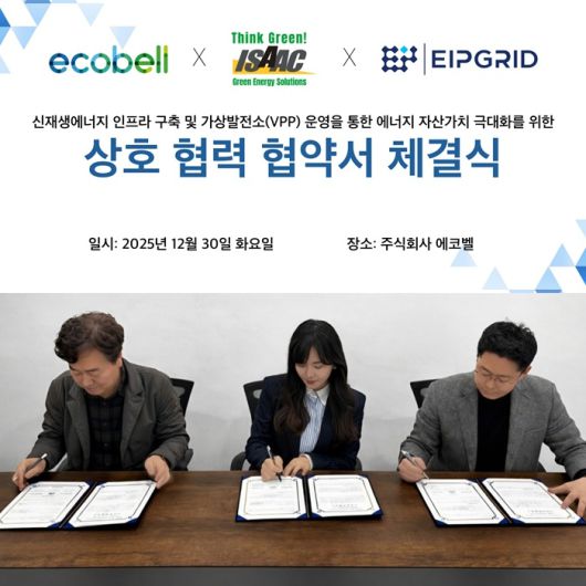 [서울경제TV=최동수 인턴기자] 기후·에너지 산업에서 기술력과 실행력을 동시에 갖춘 에코벨, 이삭지이에스, 이아이피그리드가 재생에너지·가상발전소·탄소자산화 연계 공동 실증사업 추진을 위한 업무협약을 체결했다고 12일 밝혔다.