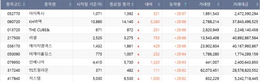 아이톡시는 전 거래일 대비 29.97%(321원) 오른 1392원에 마감했다. KH바텍은 29.96%(3260원) 상승한 1만4140원, THE CUBE&도 29.96%(201원) 오른 872원에 장을 마쳤다.