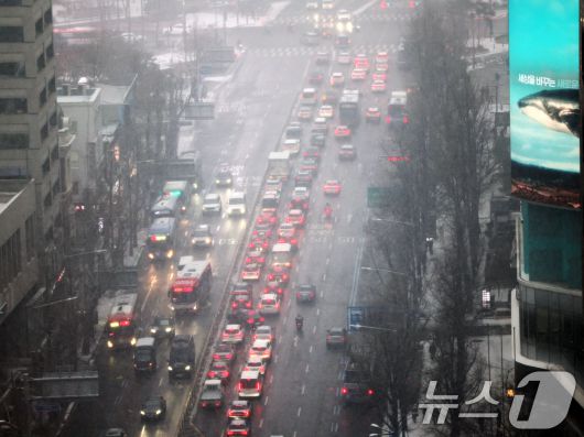 눈이 내리는 12일 오후 서울 남대문로 일대가 차량 정체를 빚고 있다. 2026.1.12/뉴스1 ⓒ News1 황기선 기자 |